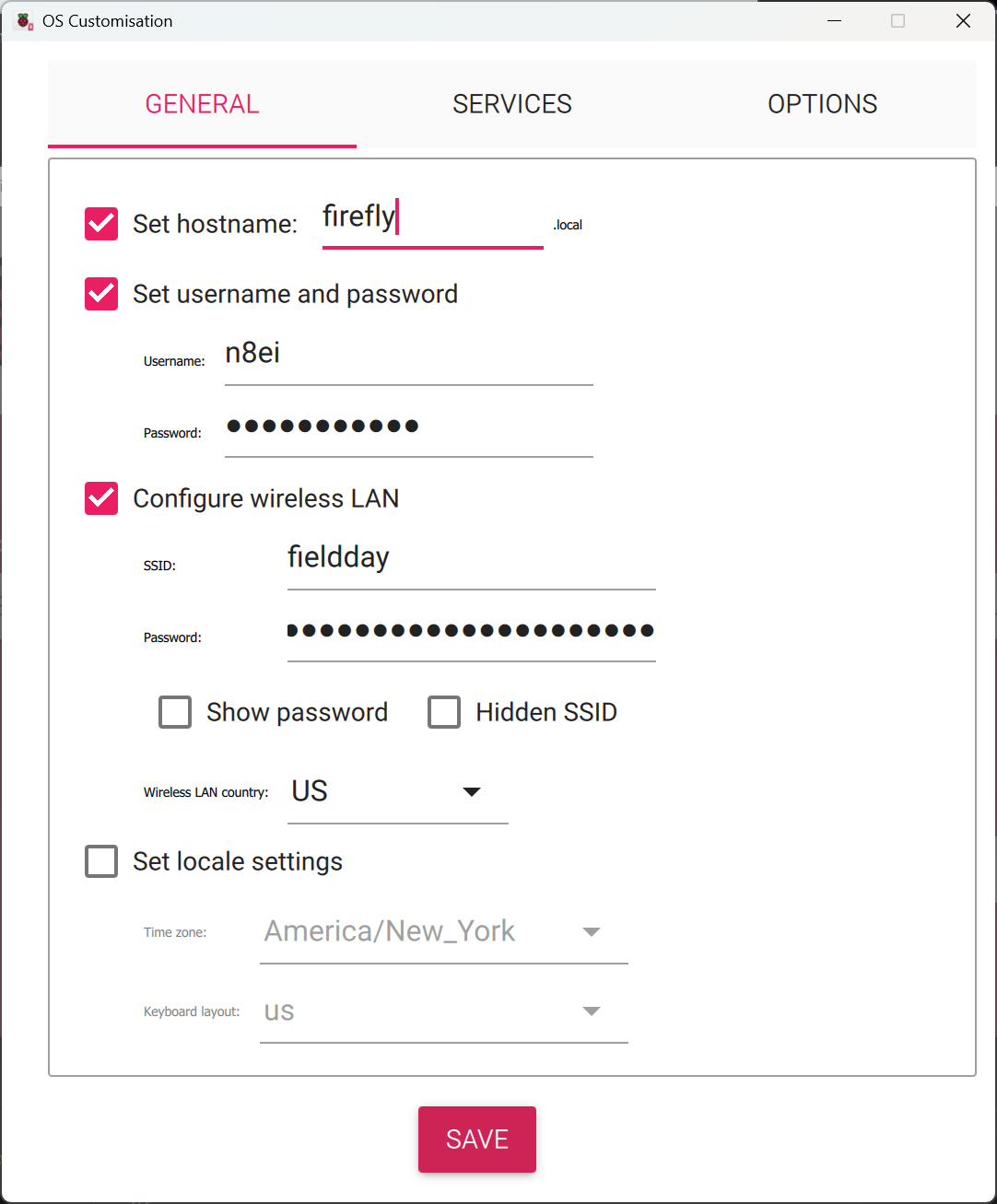 fireflywhich will set the hostname on the network tofirefly.local.Create the user for the device. Check the box and set a username and password. This can be anything, but it is recommended to be set to the operation callsign and a memorable password. In this example, the username was "n8ei" and the password "fieldday".