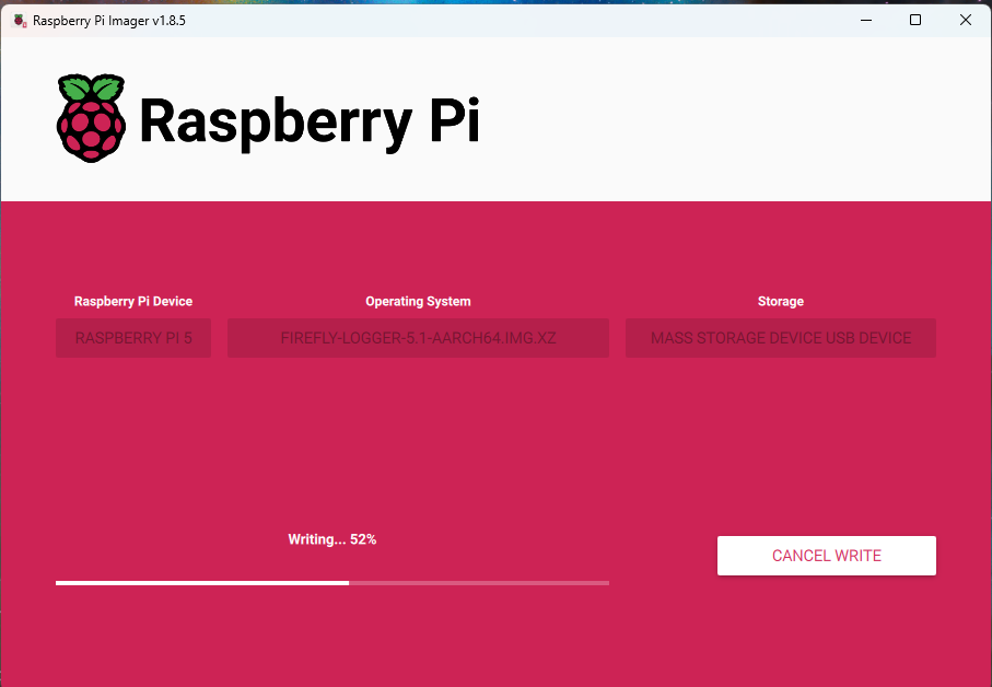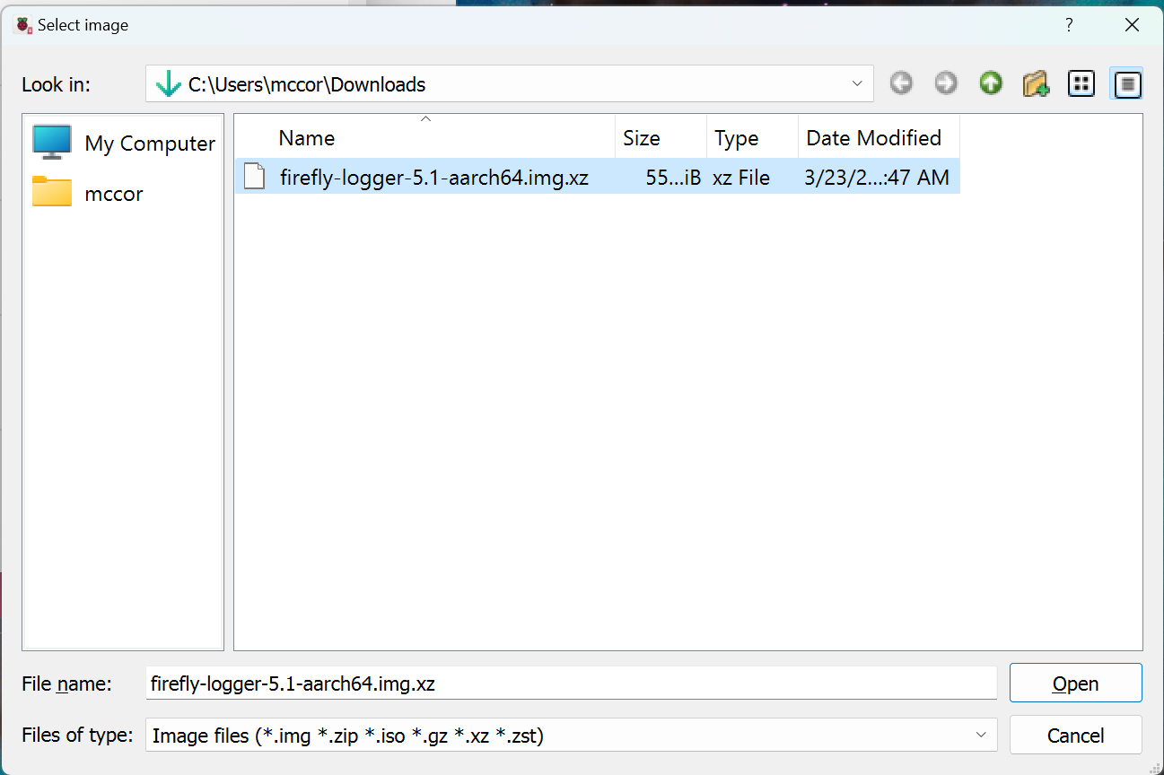 Downloadsfolder and select the image downloaded in step 2. It will be named something like firefly-logger-5.1-aarch64.img.xz. Then click Open. -