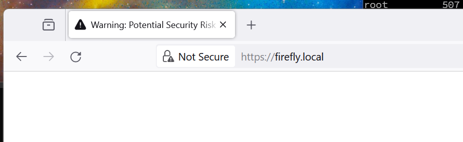 http://firefly.localinto the browser bar and hit Enter. One may receive a "host not found" error the first time depending on a variety of factors regarding browsers and networks that is unimportant here. If that happens, re-enterhttp://firefly.localand hit Enter a second time. -