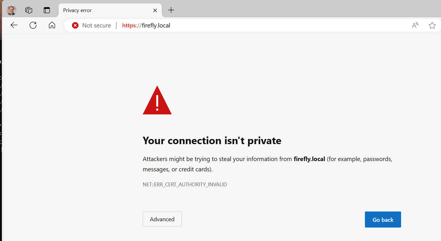 Cilck on Advanced and then Continue to firefly.local (unsafe). Firefox, Safari, etc. have similar screens with a similar warning and workflow. Each client to Firefly Logger will have to accept and/or continue past the security warning on the first connections. See Security for more information on why this is not a security risk for this application.