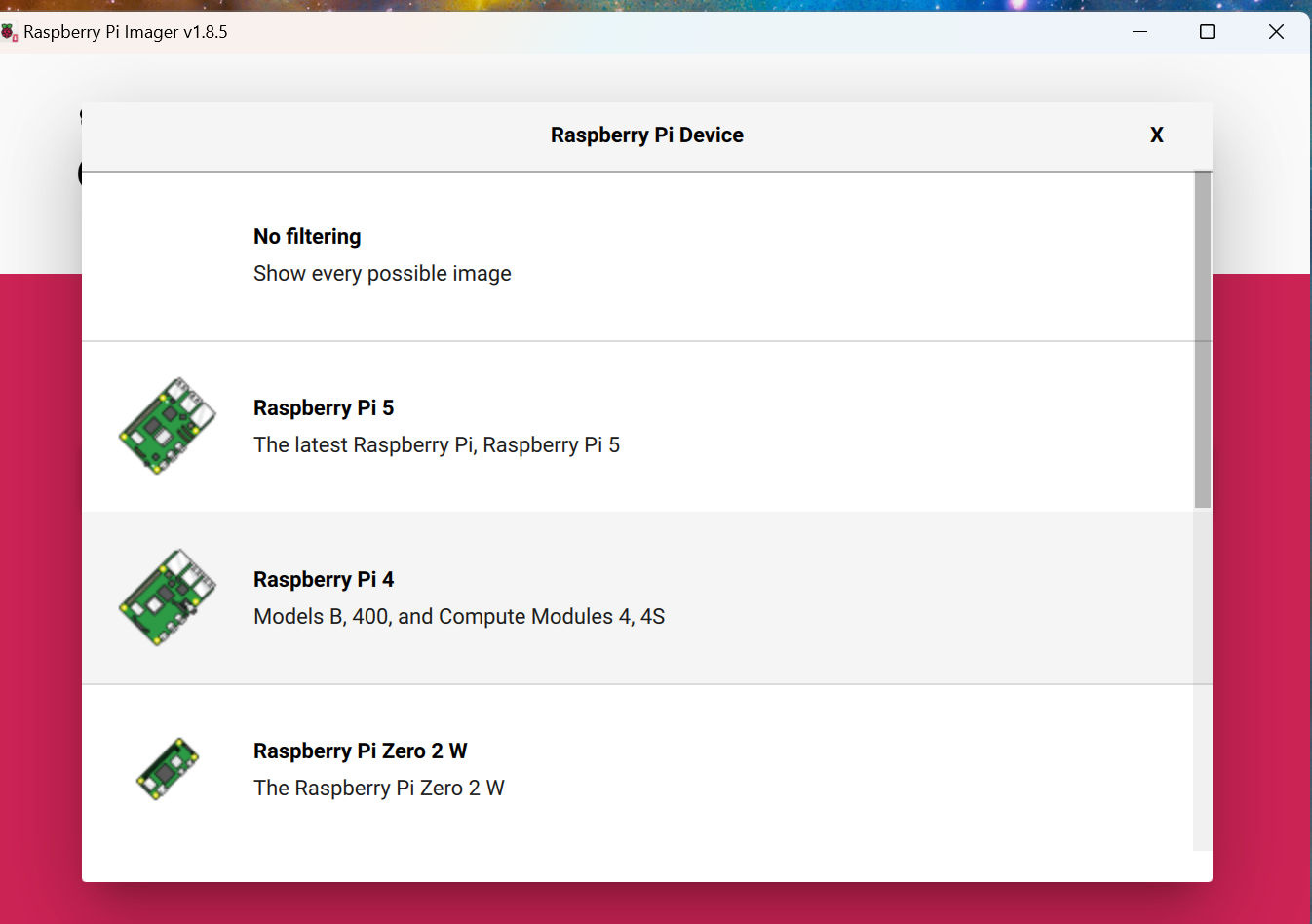 Click on CHOOSE DEVICE and choose the type of Pi hardware on which Firefly Logger is being installed.