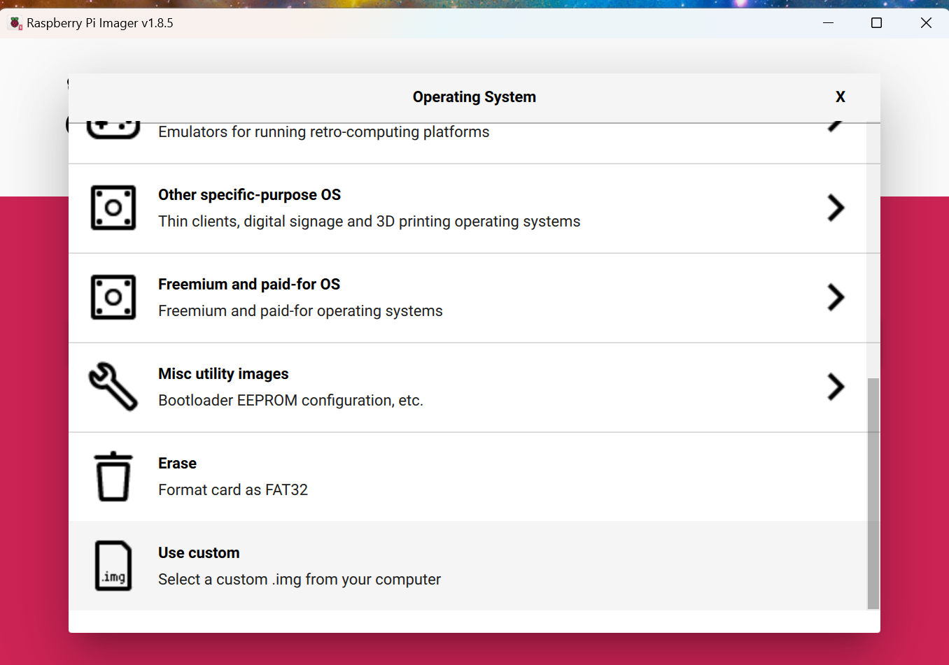 Click on CHOOSE OS. Scroll to the bottom of the list that appears and select Use custom.