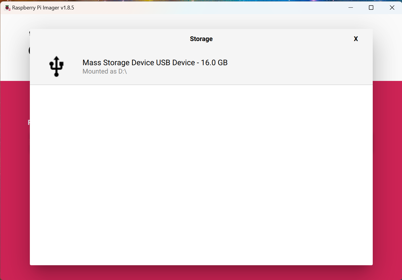 Connect the SD card or the SD card in a USB adapter to the computer. Then click on CHOOSE STORAGE. An option will be presented named something such as "Mass Storage Device USB Device - 16.0 GB". Click on that entry.
